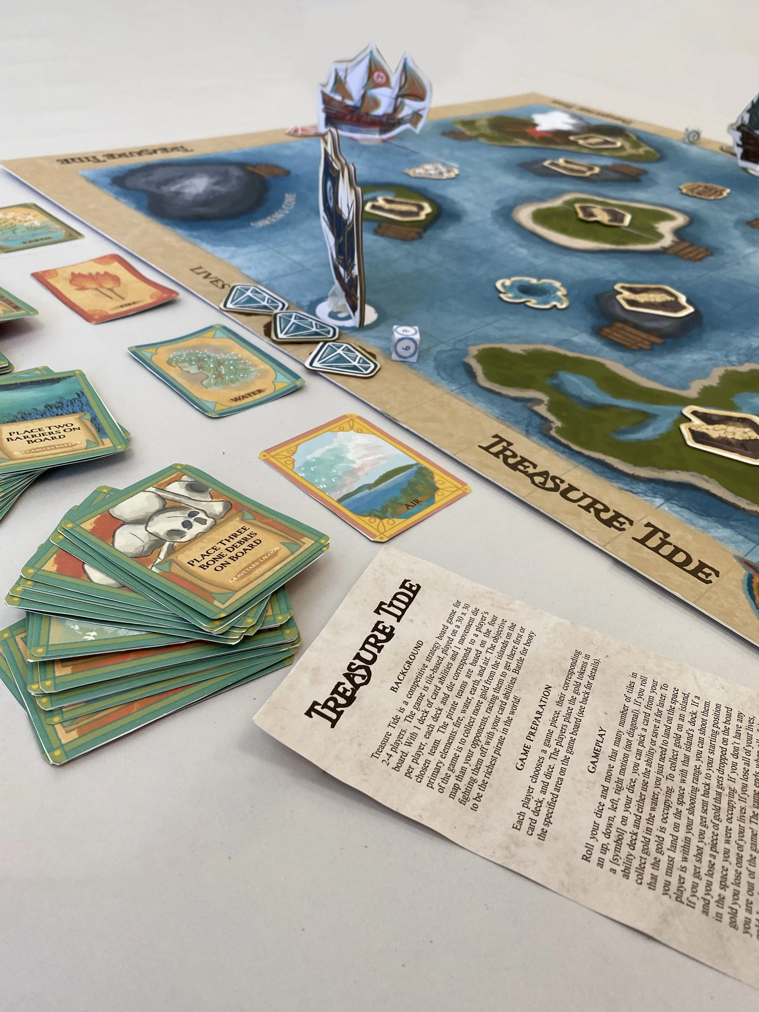 In collaboration with a computer science level design class, illustrations and gameplay were designed to create a new family friendly board game called Treasure Tide. As a team of designers, we made refinements and expanded upon the original idea of the game, ultimately illustrating all game pieces in a collective style that would allow the board game to resonate with the intended audience of 12 and older.